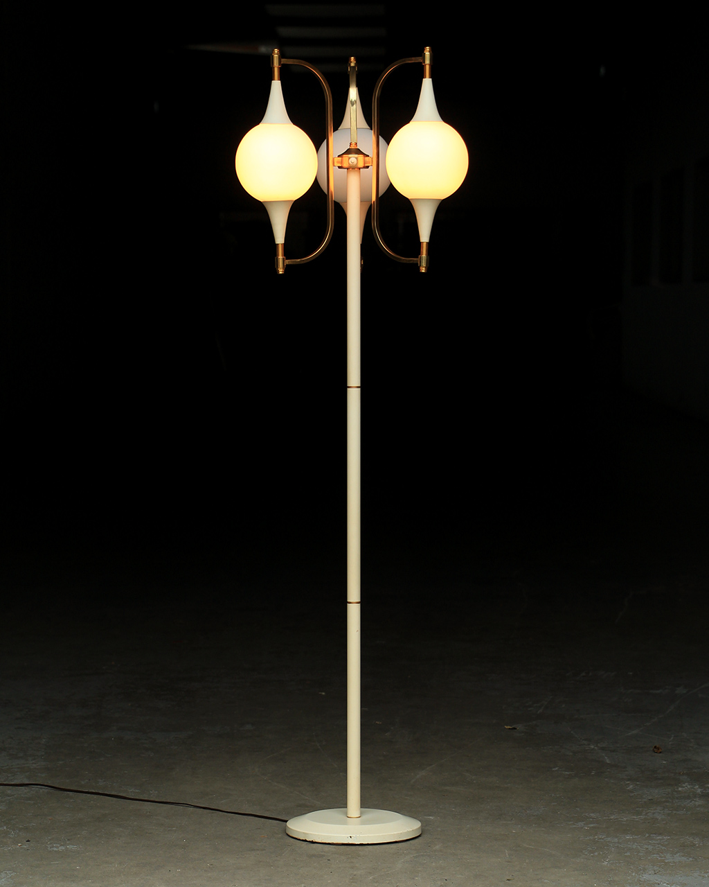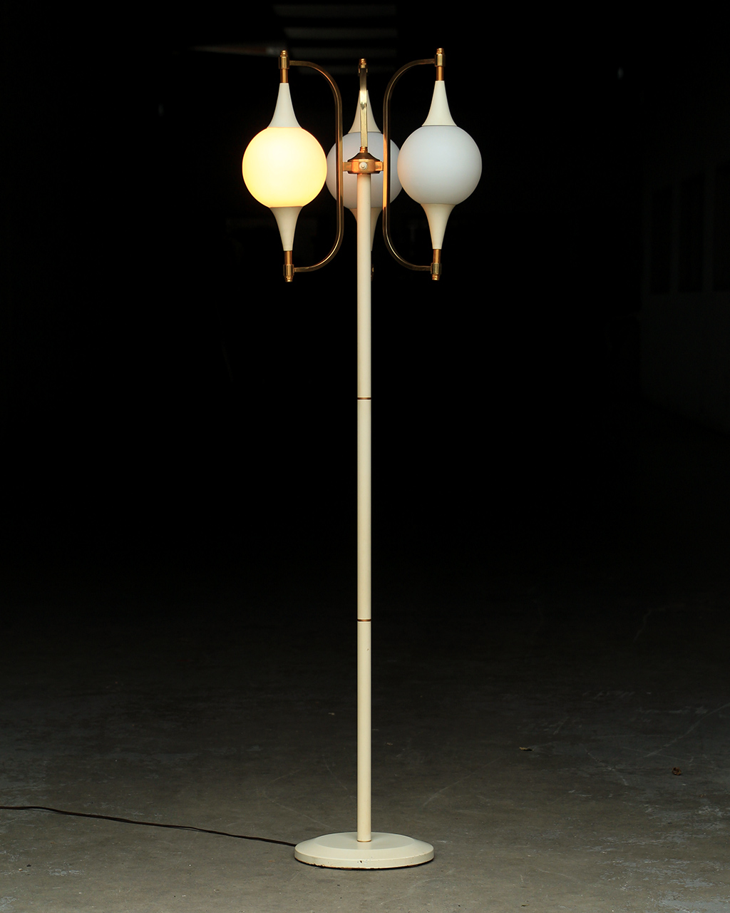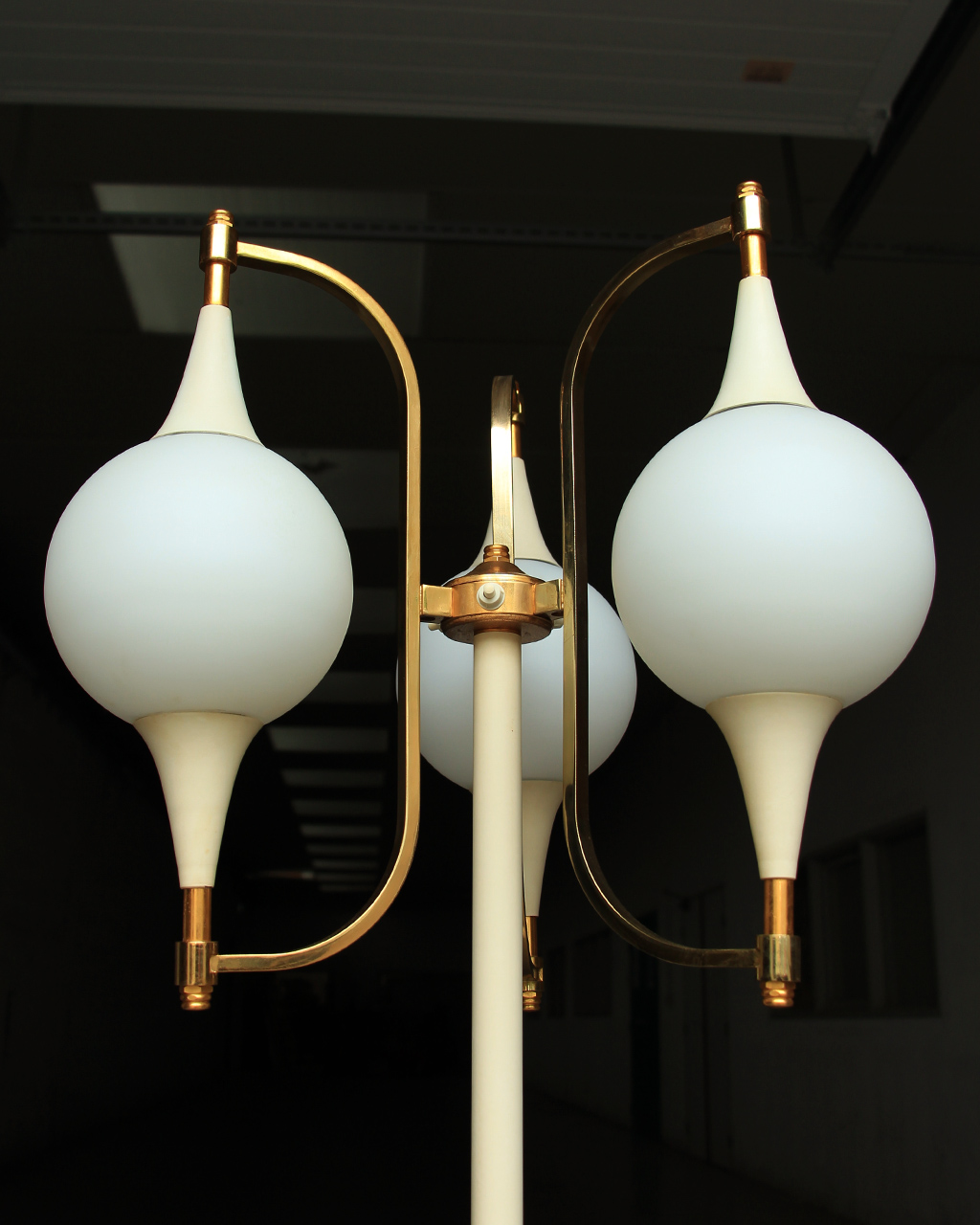 En métal laqué blanc et doré et globes en verre opalin.