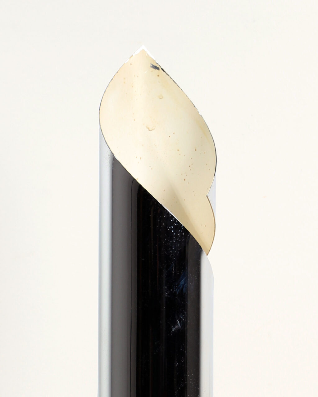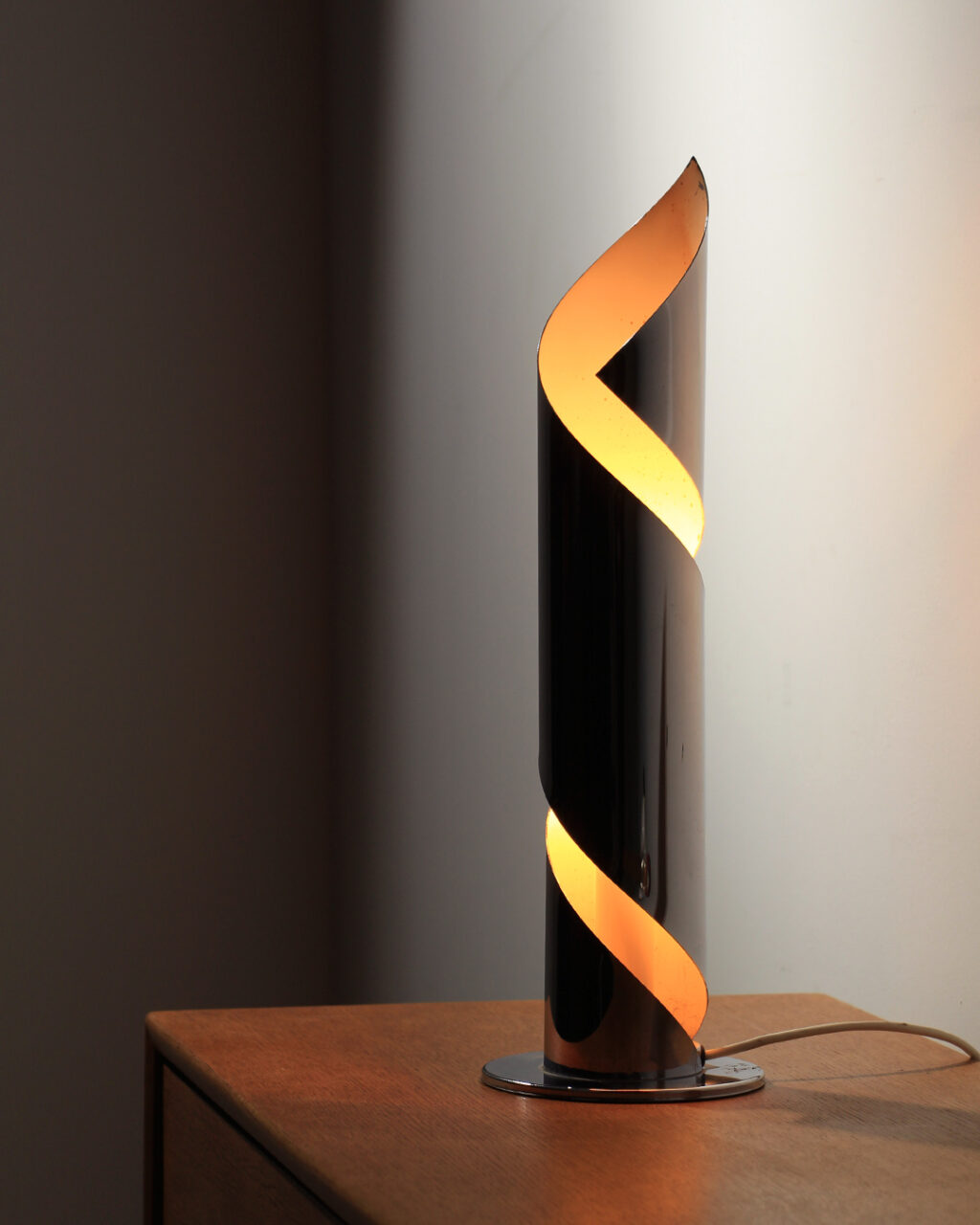 Tube découpé en spirale, chromé et laque blanche à l’intérieur.
